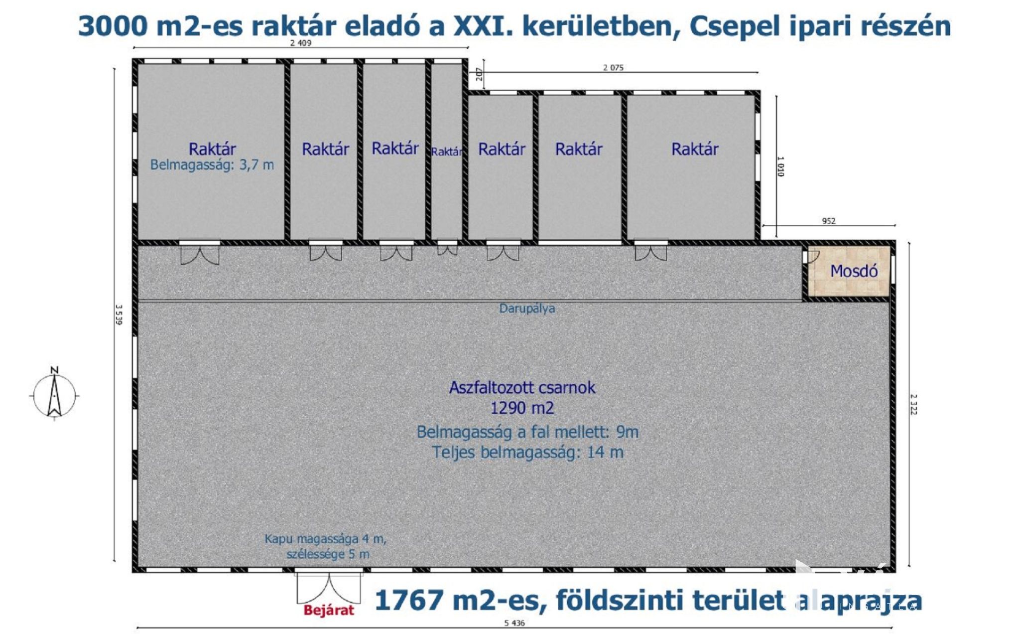 FÖLDSZINT: 1767 m2, melyből 1290 m2 óriási csarnoktér. Az aszfaltozott csarnokban a falak melletti 9 méteres belmagasság és 14 méteres teljes belmagasság magas állványrendszerek vagy nagy gépsorok elhelyezésére is gond nélkül alkalmas.