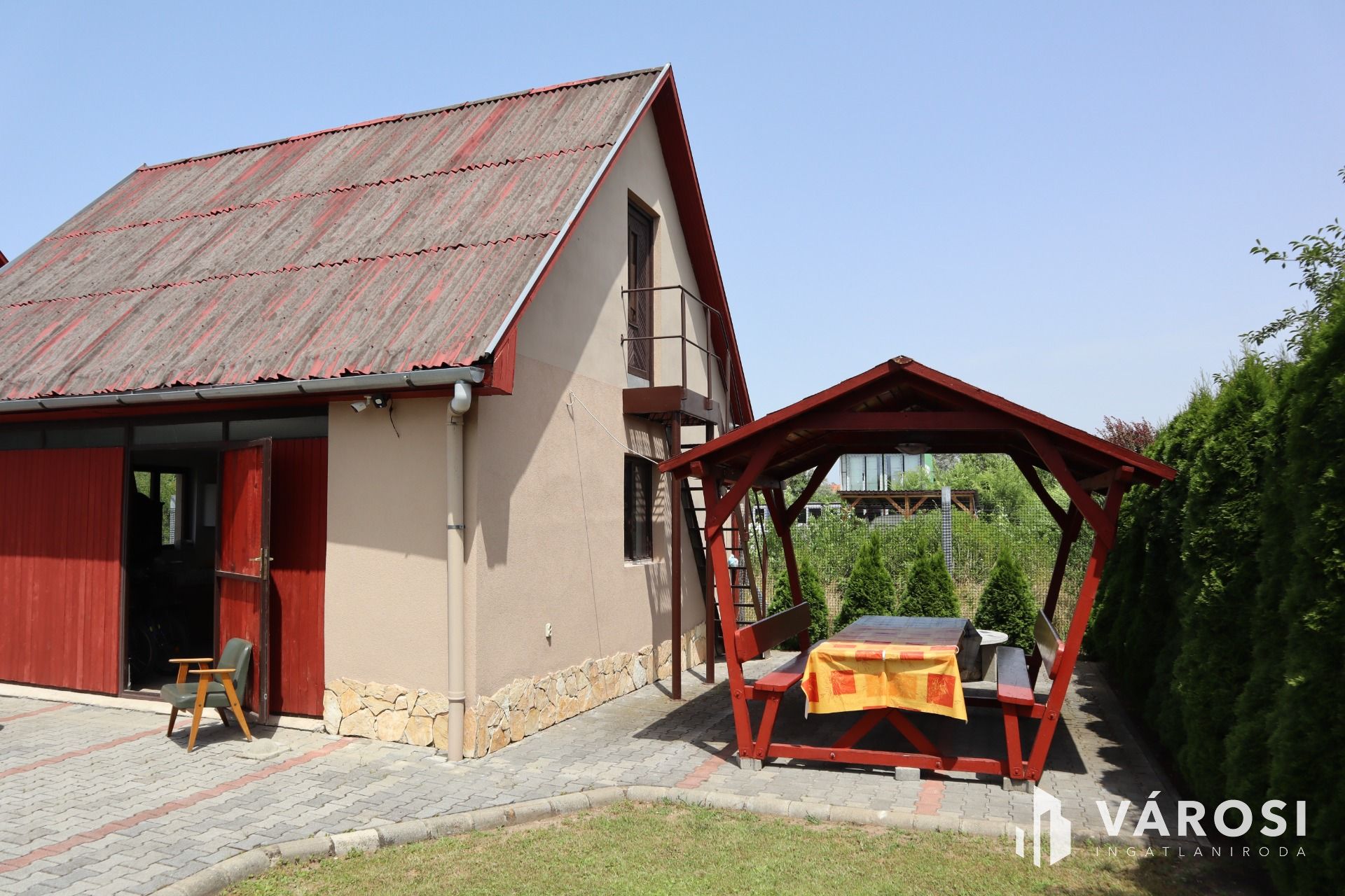 Csendes utcában, zöld övezetben helyezkedik el, a parkosított kertben minden adott a nyugodt kikapcsolódásra. Kialakításra került egy kerti grillezőhely, továbbá egy kétállásos garázs, amely jelenleg tárolóként funkcionál. A térkövezett udvaron akár 10 autó részére is biztosított a parkolás.