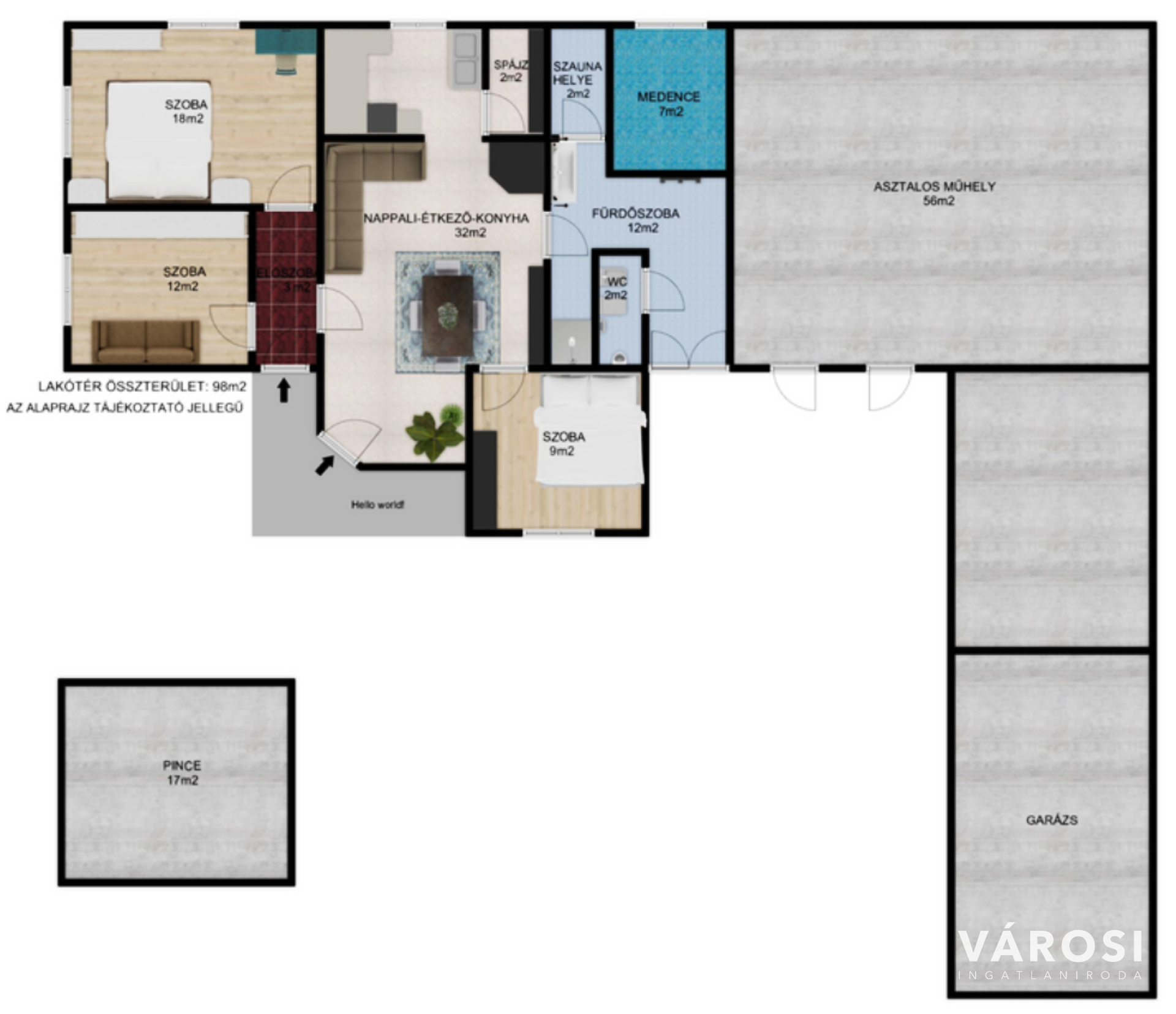 - 446 m2 lakótér, ebből 98m2 berendezett költözhető, 50 m2 garázs, 48m2 asztalosműhely amely az utcáról is megközelíthető.