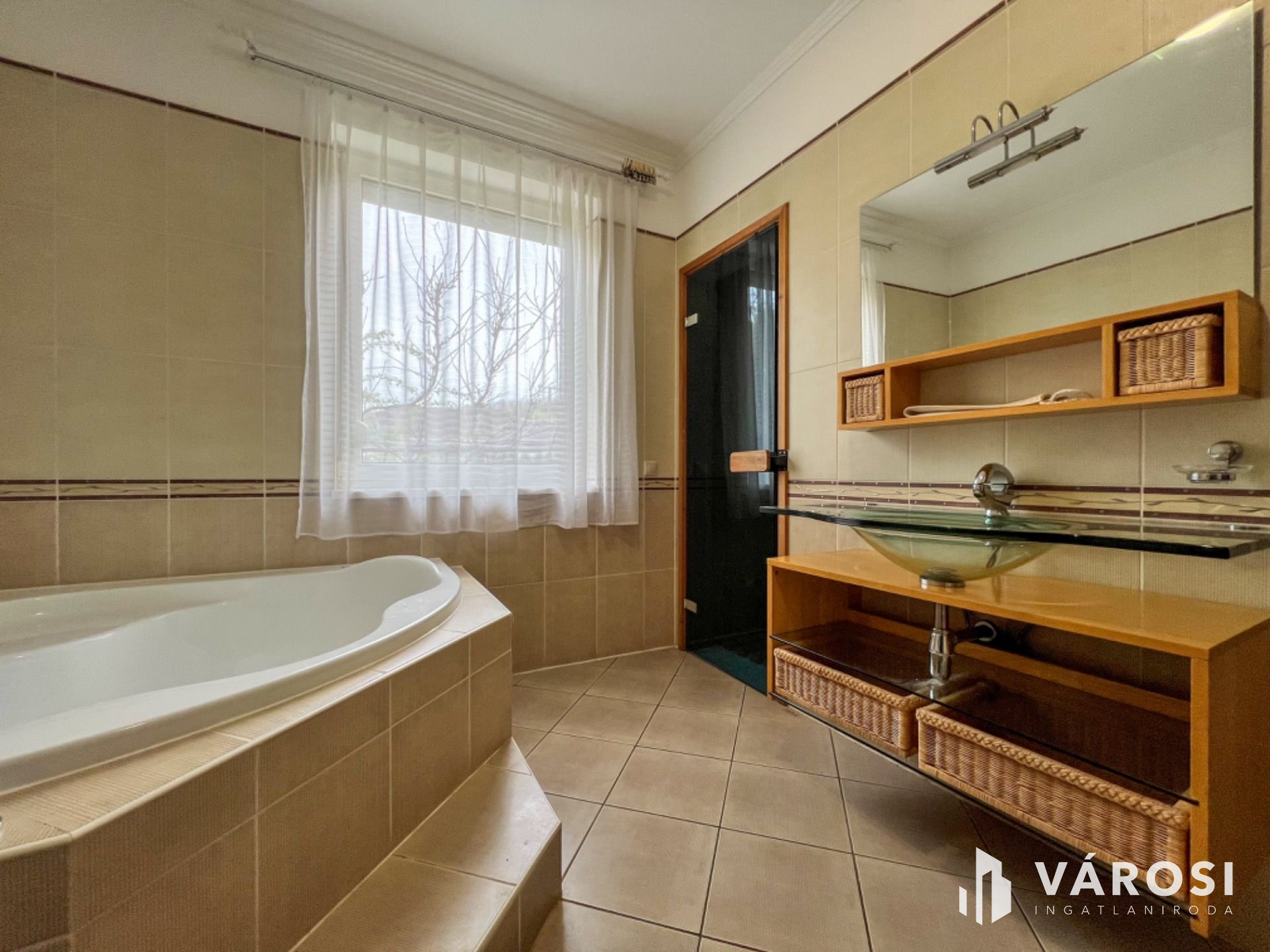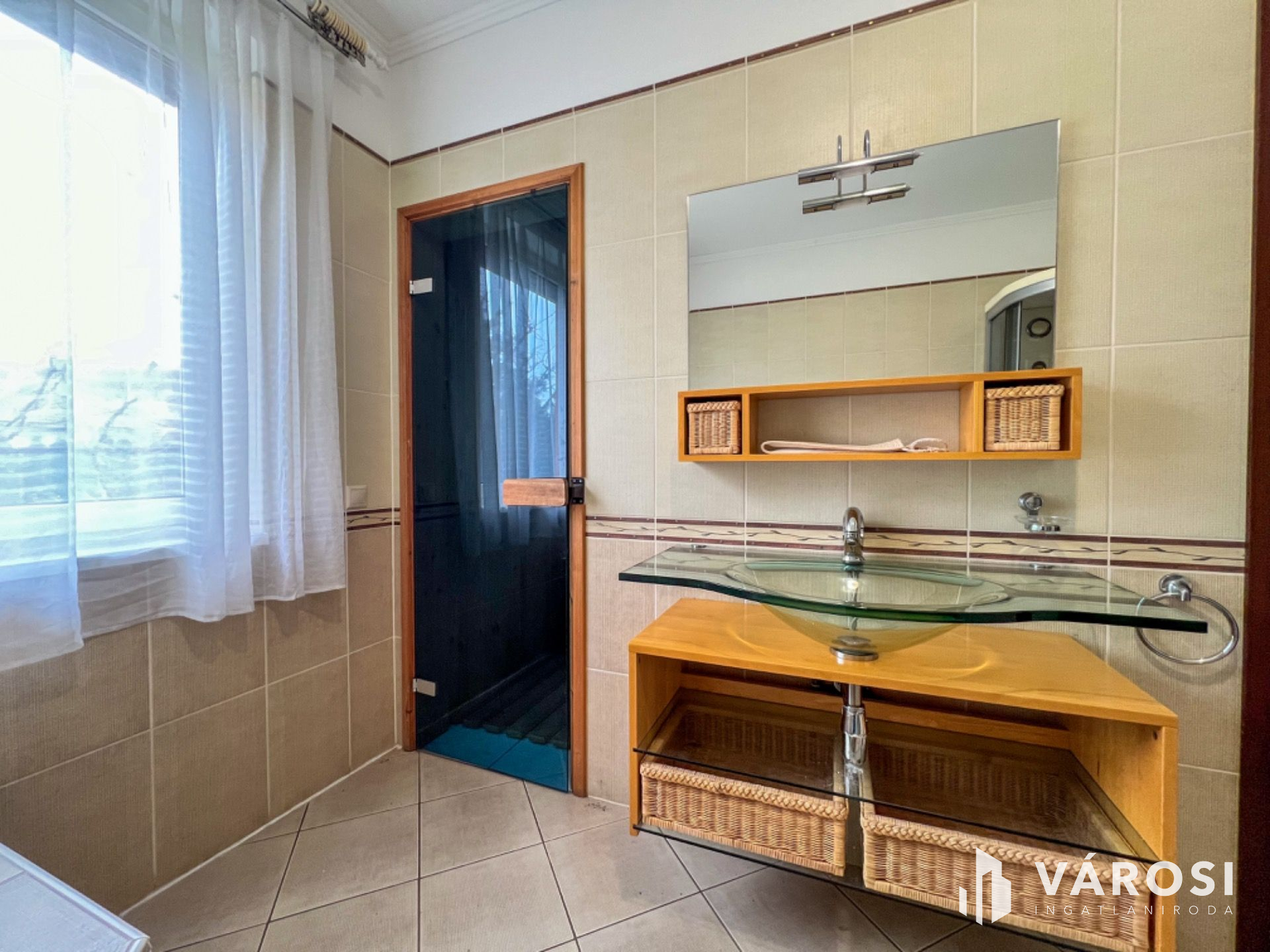 Helyiségei: 2 hálószoba, nappali, konyha+étkező, kamra, közlekedő, gardrób, mosóhelyiség, fürdőszoba, szauna, külön nyíló W.C., szélfogó, garázs, beépített terasz, nyitott terasz.