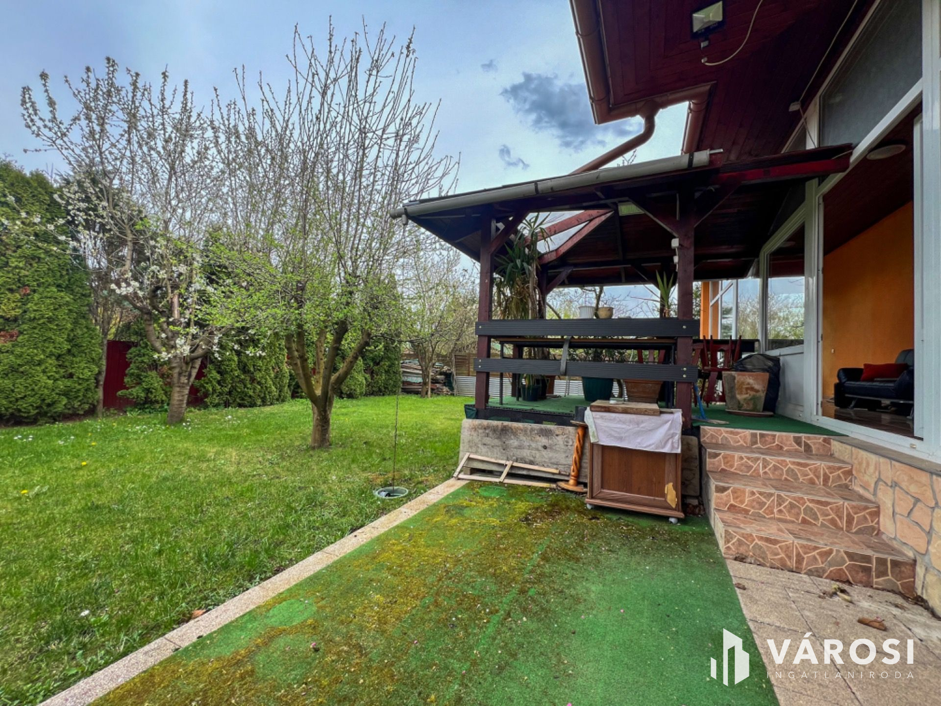 Az ingatlanhoz tartozó telek cca. 300 nm nagyságú, körbekerített, udvari gépkocsi beálló, nyitott terasz, kerti tároló, kemence, fúrt kút, tuják, gyümölcsfák találhatók.