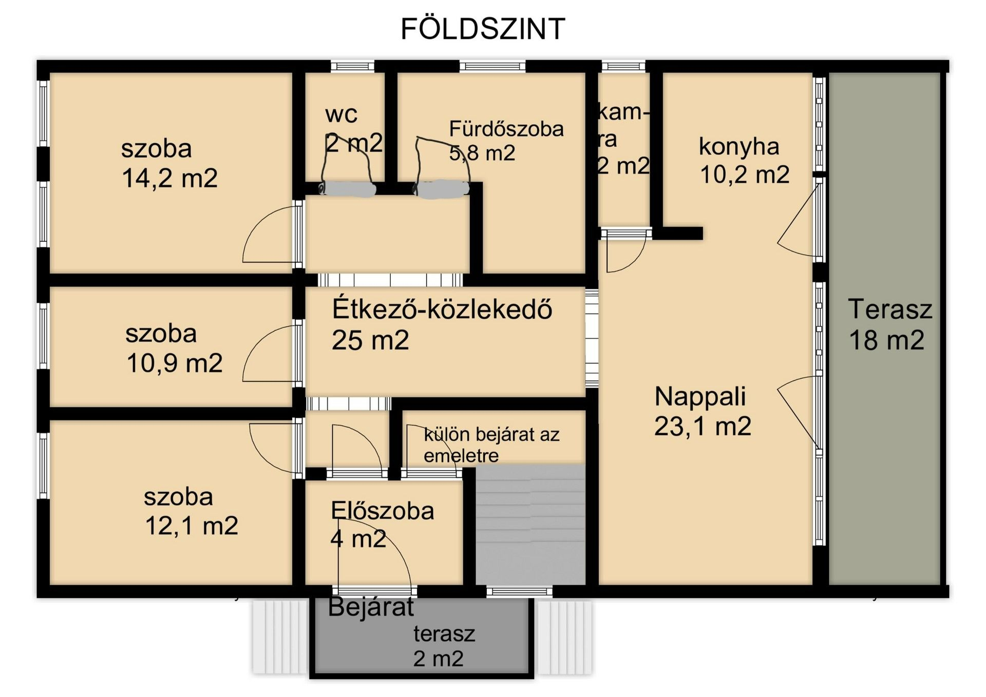 A földszinti lakás külön bejárattal: nappali-étkező-konyha, 3 hálószoba, fürdőszoba, wc, és kamra helyiségekből állnak.
