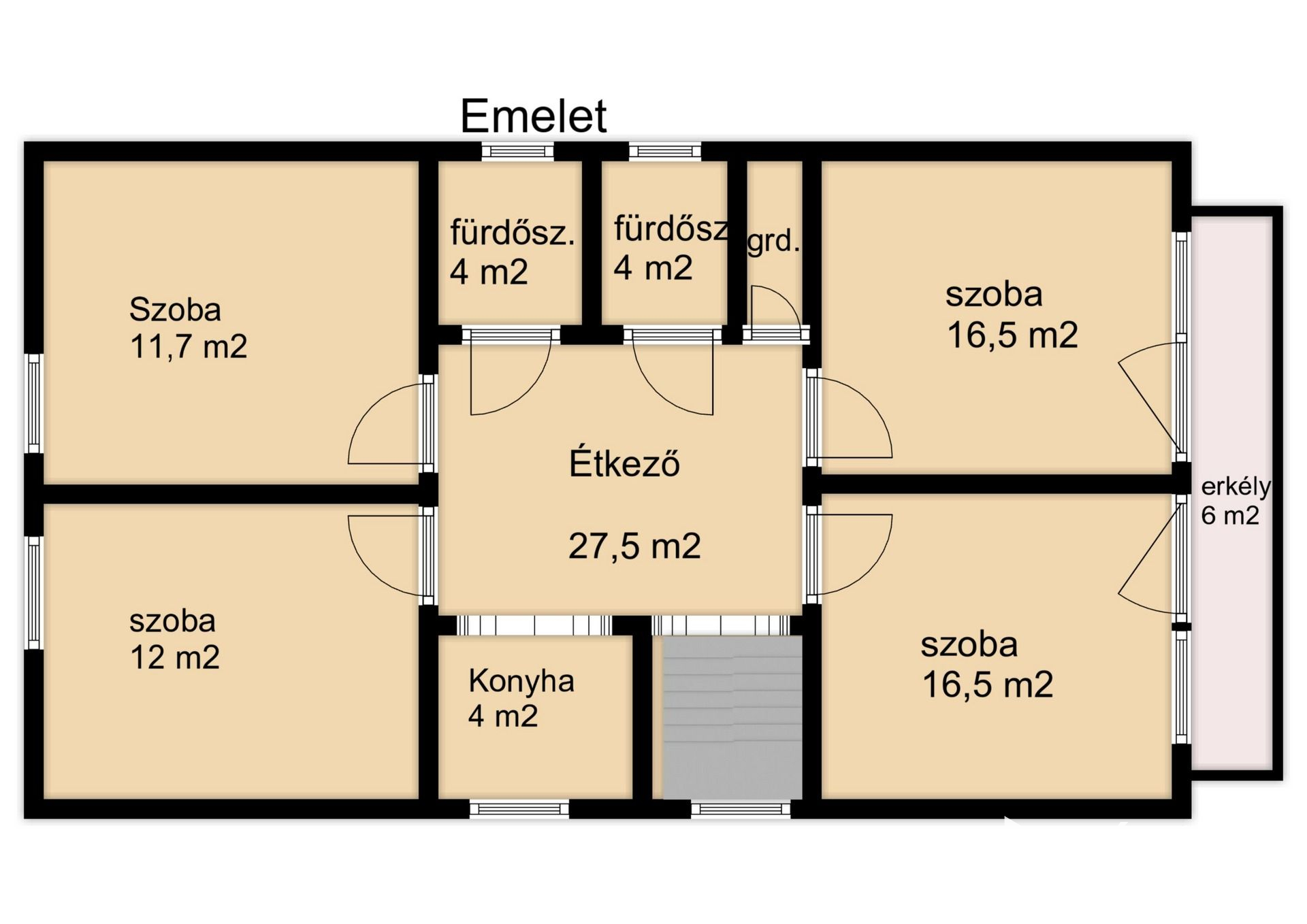 Itt : konyha-étkező, 4 szoba, 2 fürdőszoba , tároló, valamint egy erkély található.