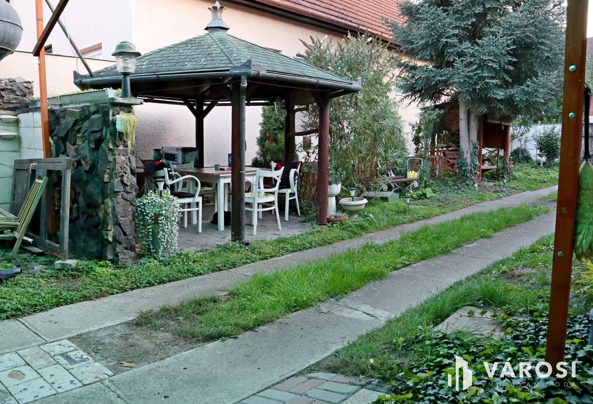 Az elkerített, rendezett telek mérete 412 m2, amelyen helyet kapott egy garázs és egy kisebb melléképület is.