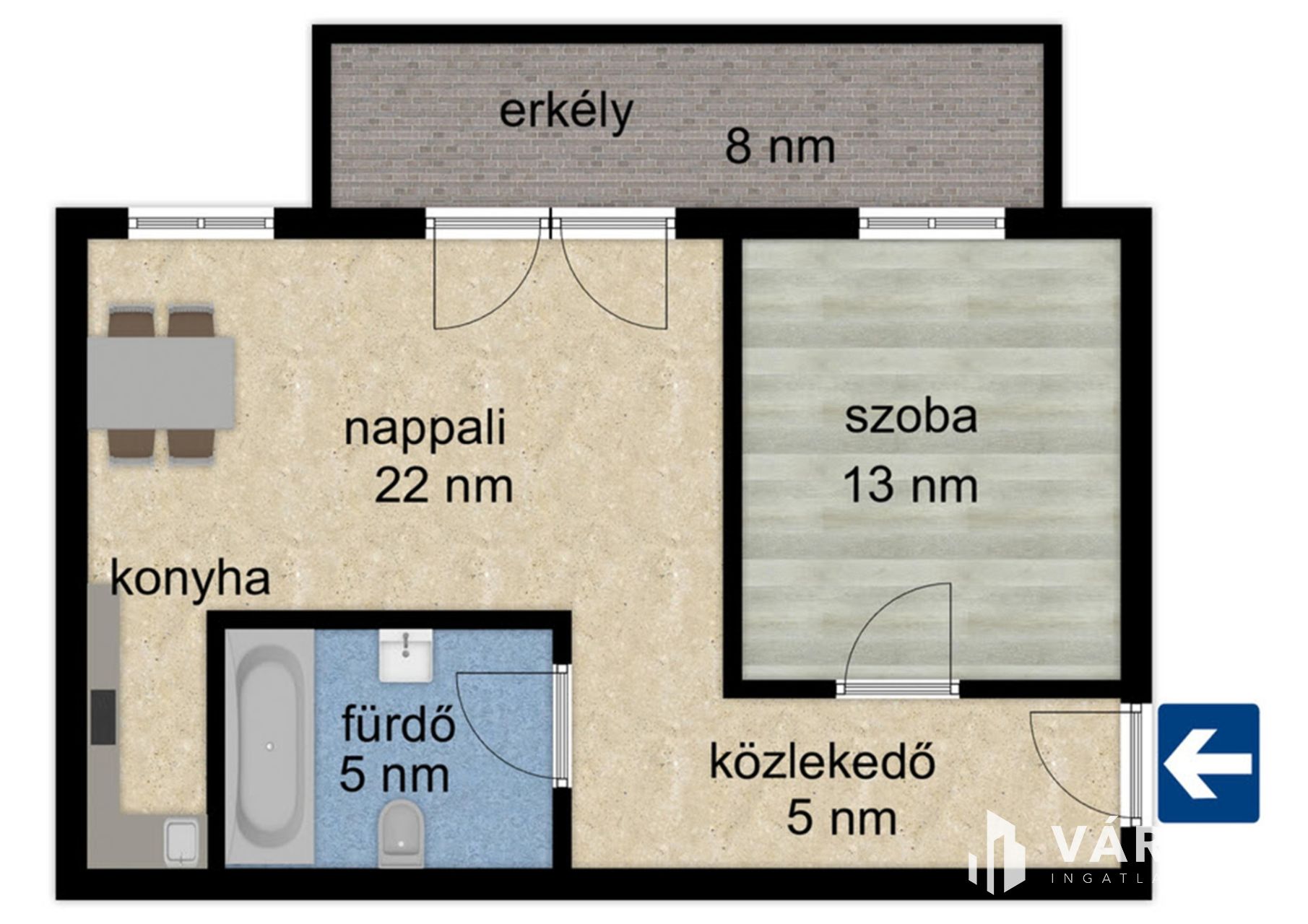 - Amerikai konyhás nappali + 1. szoba, fürdő, erkély.