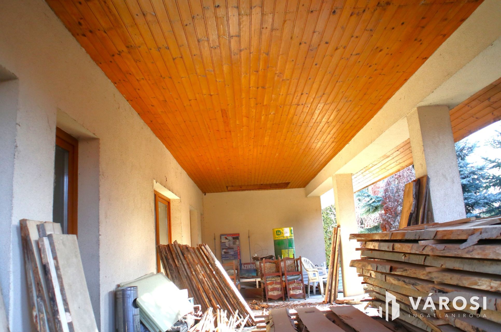 + 50m2-es fedett terasz oszlopokkal, mennyezetét borovi fenyővel burkolták,