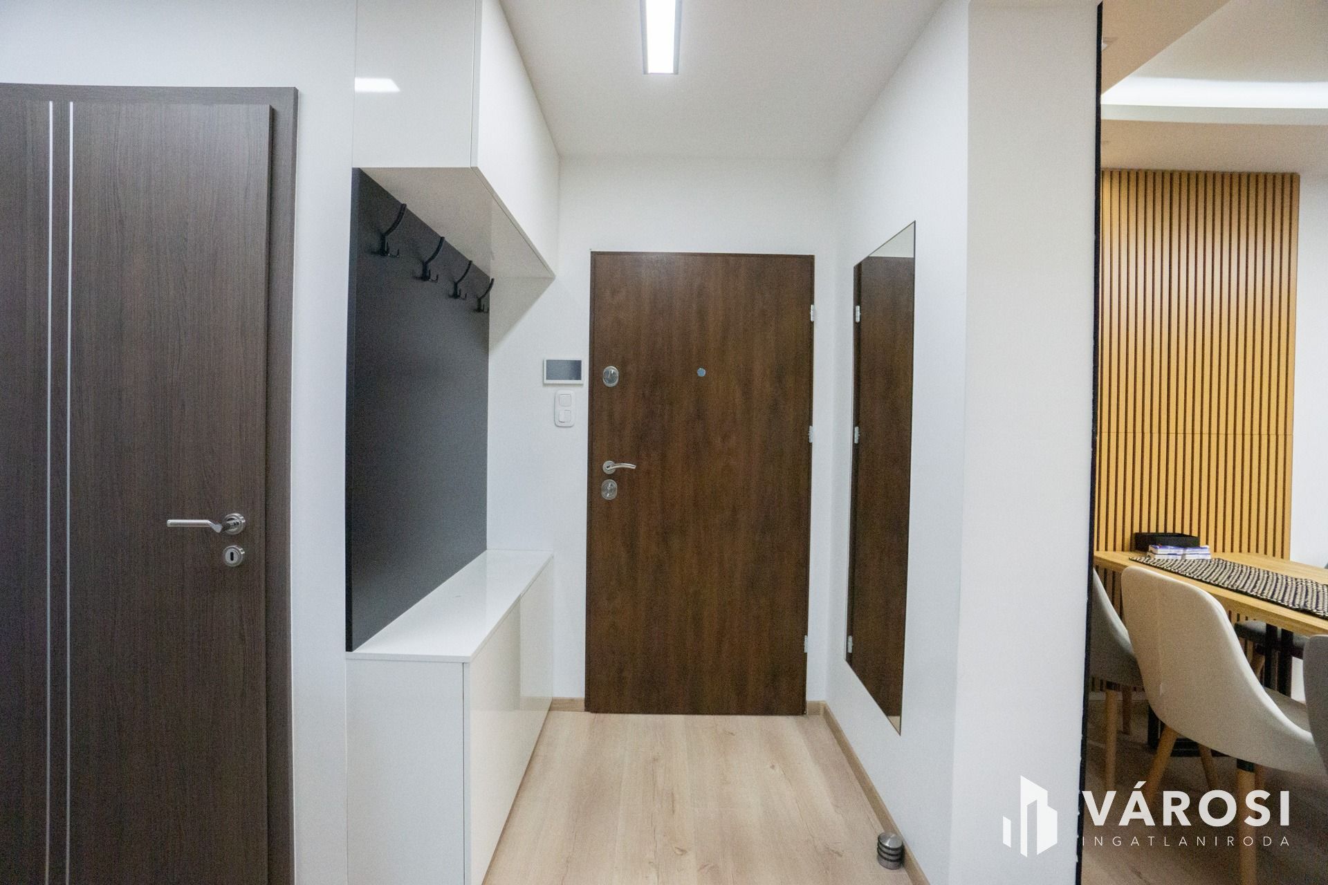 Elosztása szerint: nappali-konyha-étkező, 1 hálószoba hatalmas gardróbbal, zuhanyzós fürdőszobával, 1 szoba, fürdőszoba, wc, előtér, folyosó elrendezésű.