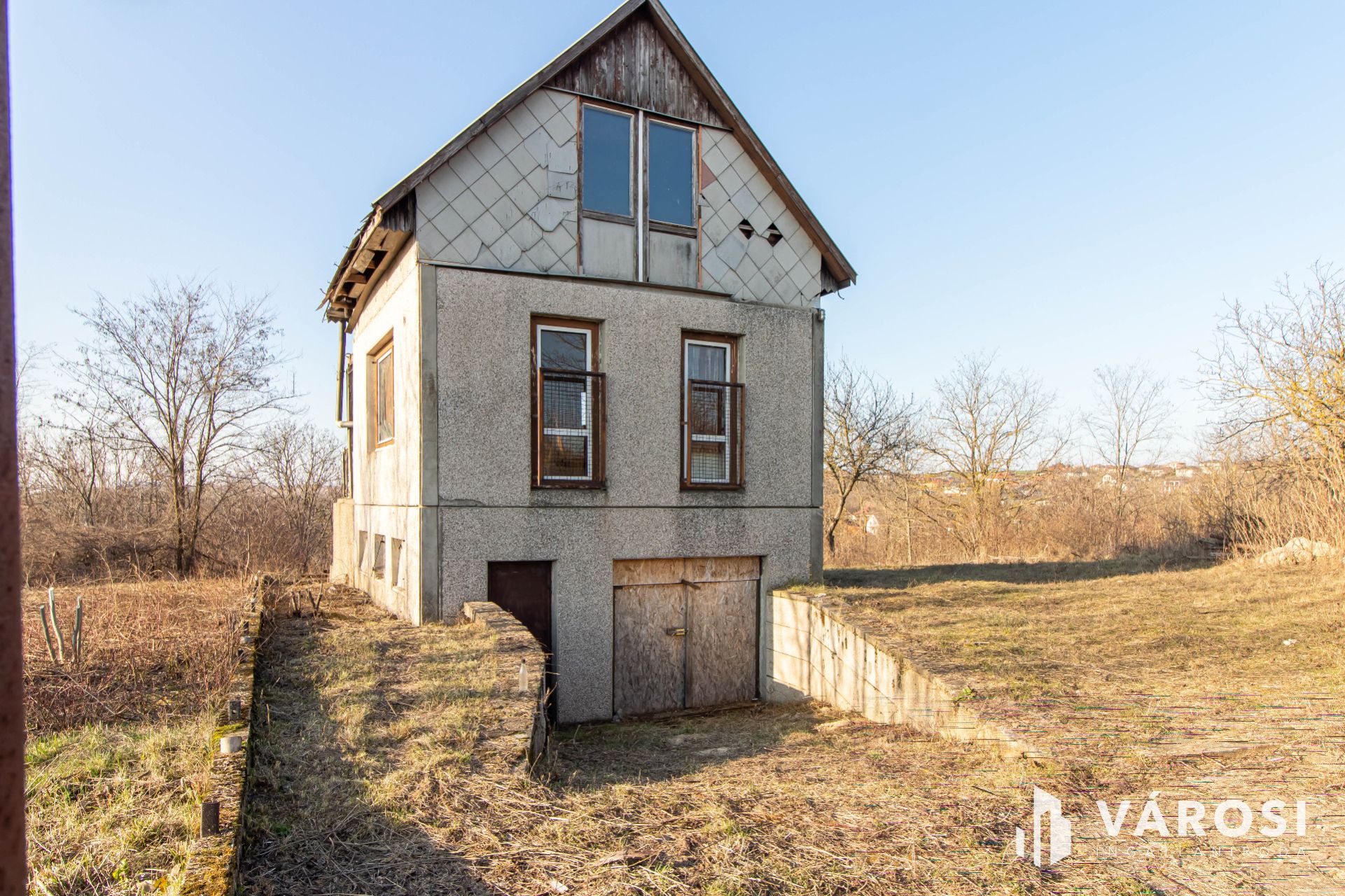A telken egy betonelemekből épült, háromszintes épület található, amely a 80-as évek óta áll a területen. Az épület teljes felújítást igényel, viszont jó alapot adhat egy hangulatos hétvégi ház kialakításához. A ház kb. 30 m²-es, és három szintből áll: egy szuterén szintből, egy földszinti helyiségből, amelyhez kb. 6 m²-es terasz kapcsolódik, valamint egy tetőtéri szintből, amelyhez egy kb. 4 m²-es terasz tartozik. A felső teraszról szép panoráma tárul elénk, ami igazán különleges hangulatot ad a helynek.