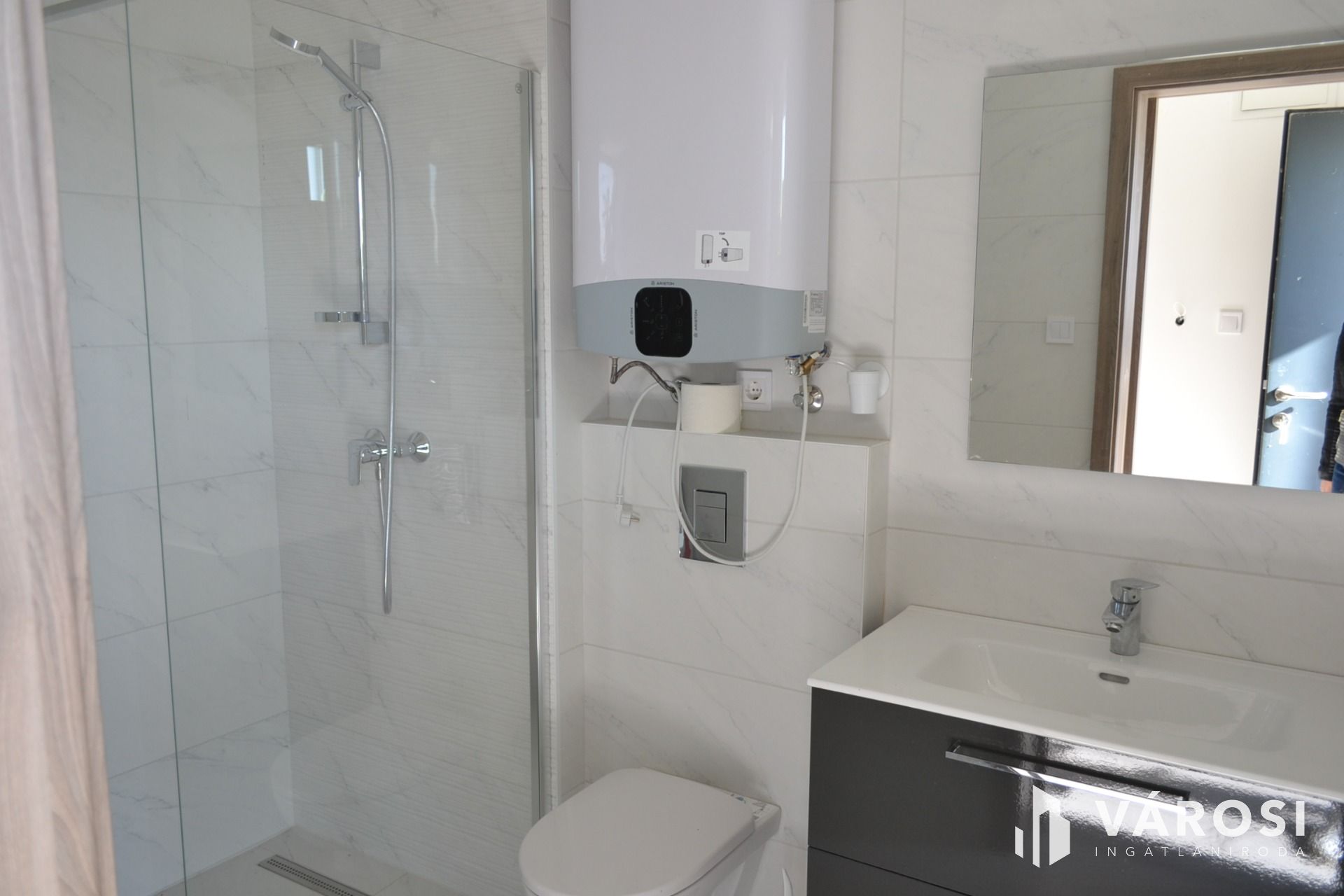 Fürdőszobájában elektromos bojlerrel, tusolókabinnal.